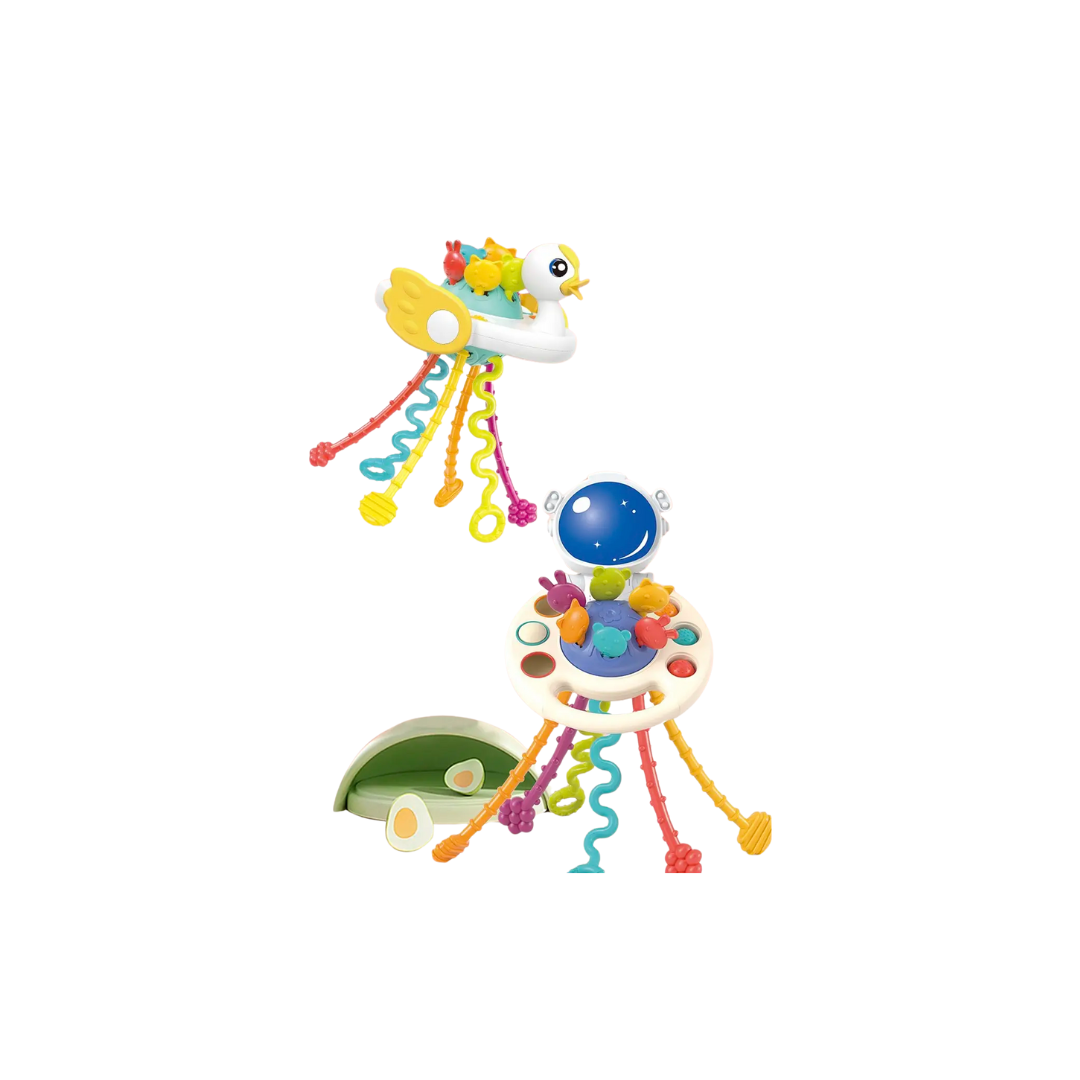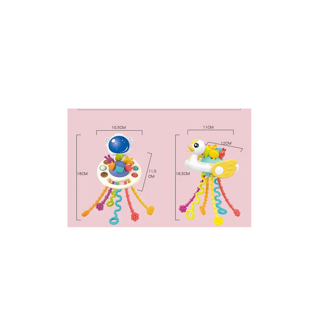 Un juguete multisensorial lleno de color y movimiento, diseñado para estimular la curiosidad y las habilidades motoras finas de los bebés. Incluye piezas texturizadas, cuerdas flexibles y elementos giratorios que invitan a explorar, tirar y tocar. Su diseño lúdico y seguro ofrece horas de entretenimiento mientras promueve la coordinación, el descubrimiento y el juego autónomo. Ideal para incentivar la estimulación temprana de manera divertida.