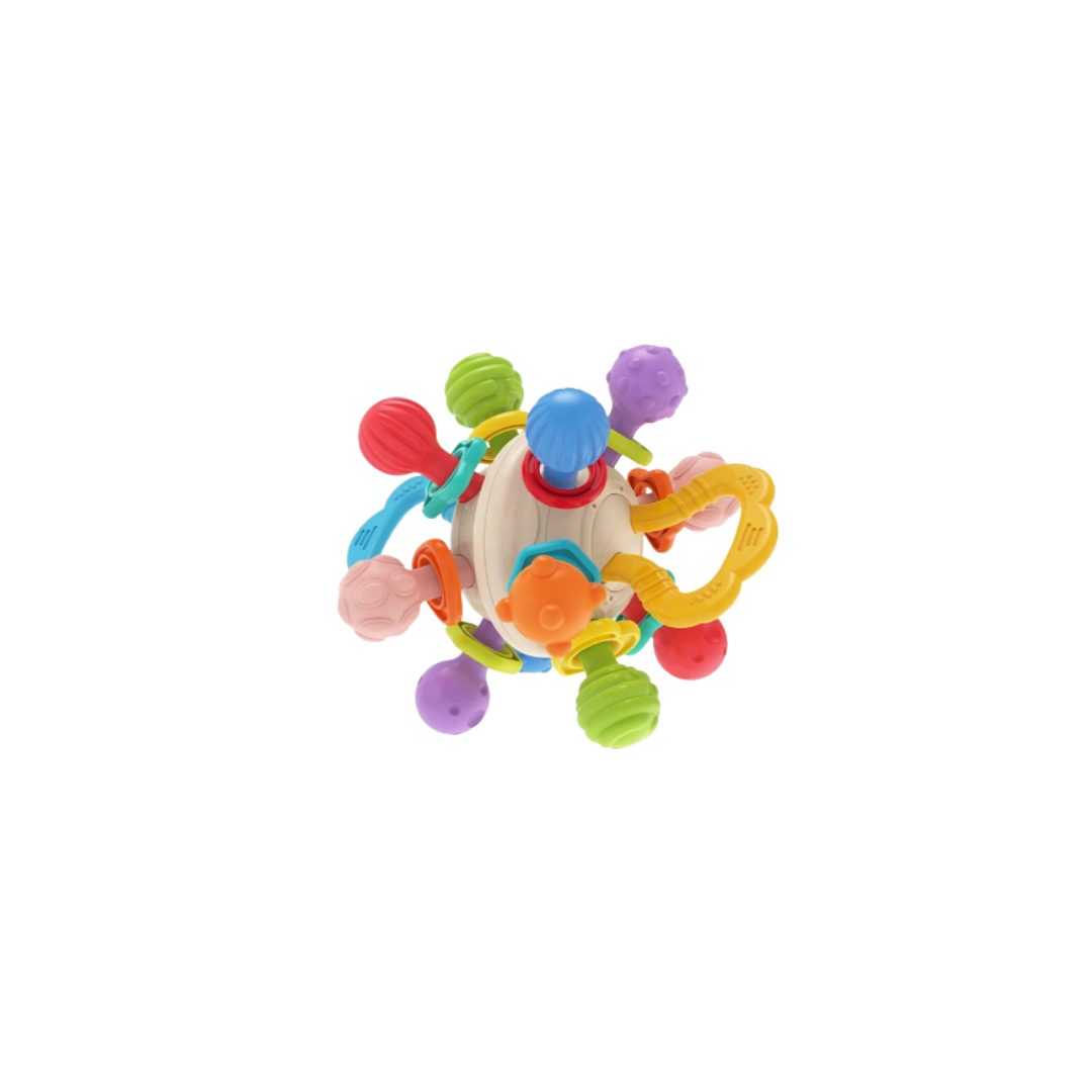 Este mordedor estimula todos los sentidos: sus distintas texturas alivian las encías, los colores vivos captan la atención visual y los suaves sonidos despiertan la curiosidad.